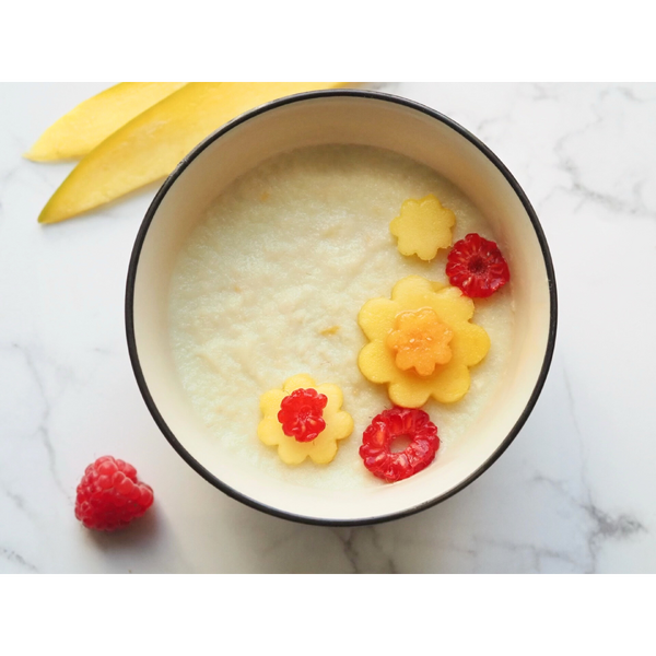 Instantní rýžová kaše 37 %, kokosový tuk, sušený glukózový sirup, inulin 6,4 %, nativní kukuřičný škrob, třtinový cukr, vitamínový a minerální premix, lyofilizované mango 2 %, přírodní extrakt meduňky 0,43 % (meduňka, maltodextrin), sůl, emulgátor: E472e (rostlinný původ), stabilizátor: E340, aroma