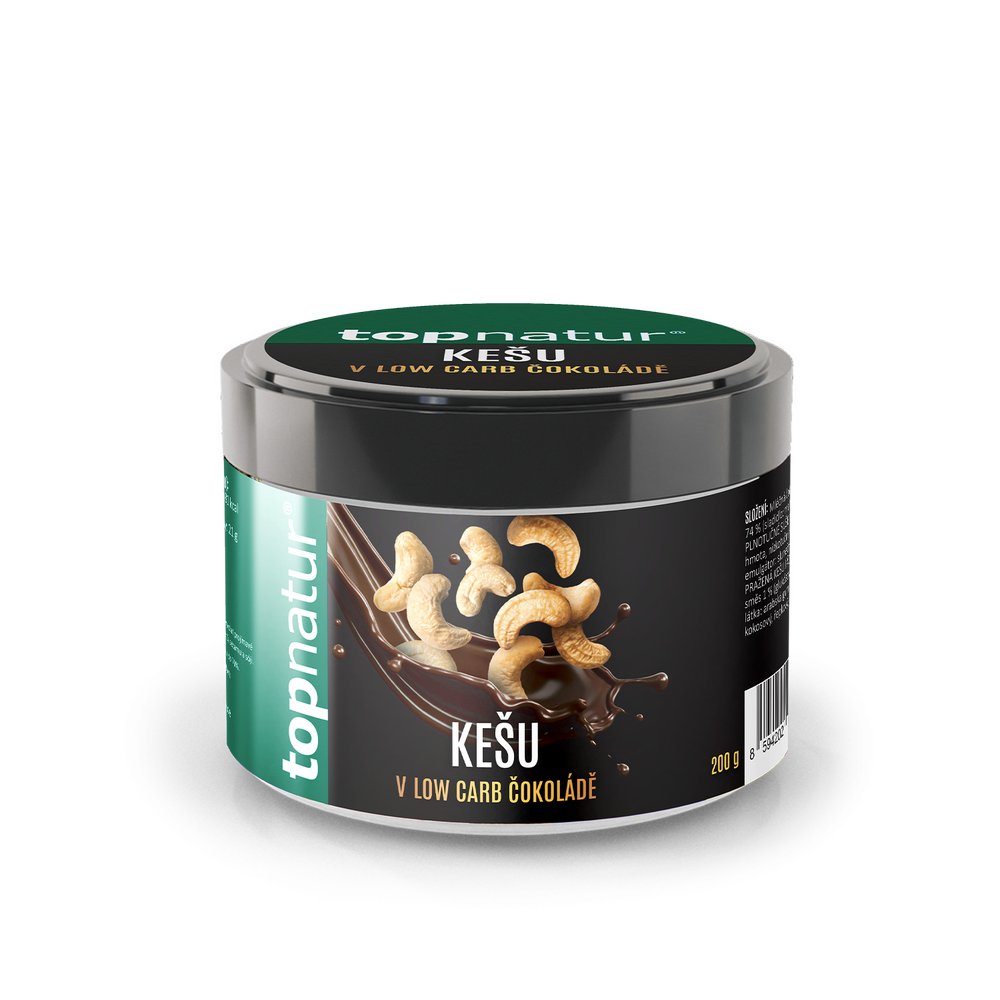 Mléčná čokoláda se sladidlem 74 % (sladidlo: maltitol, kakaové máslo, plnotučné sušené MLÉKO, kakaová hmota, nízkotučný kakaový prášek, emulgátor: slunečnicový lecitin, aroma), pražená KEŠU jádra 25 %, lešticí směs 1 %: glukózový sirup, povlaková látka (arabská guma, šelak), rostlinný olej (kokosový, řepkový), dextrin.