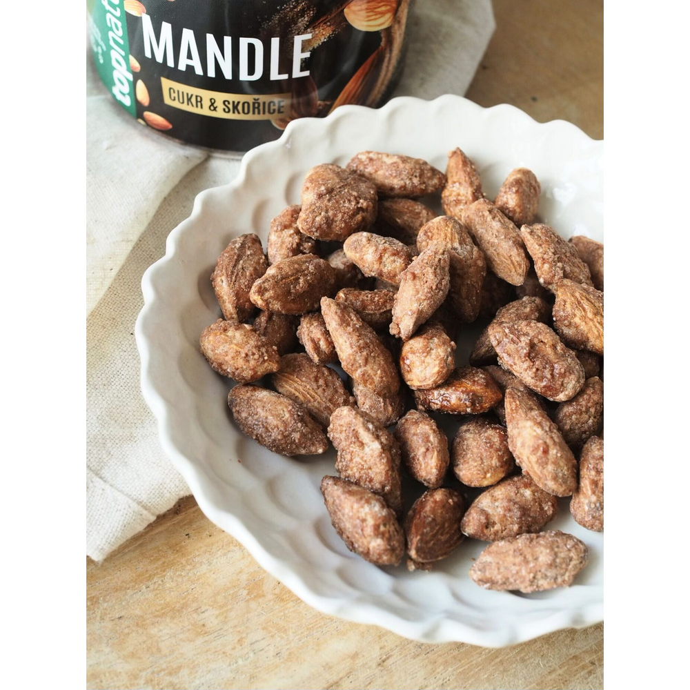 Pečlivě vybrané mandle vynikají plnou chutí a výraznou křupavostí. Sladká vrstva z cukru a skořice vytváří jemnou krustu, která se při každém kousnutí příjemně rozvoní a dodá mandlím jejich typický hřejivý charakter. Mandle z pece s cukrem a skořicí jsou ideální jako malý dárek pro radost. Skvěle doplní šálek kávy nebo čaje, ozdobí slavnostní stůl a zpříjemní večerní chvíle u televize.