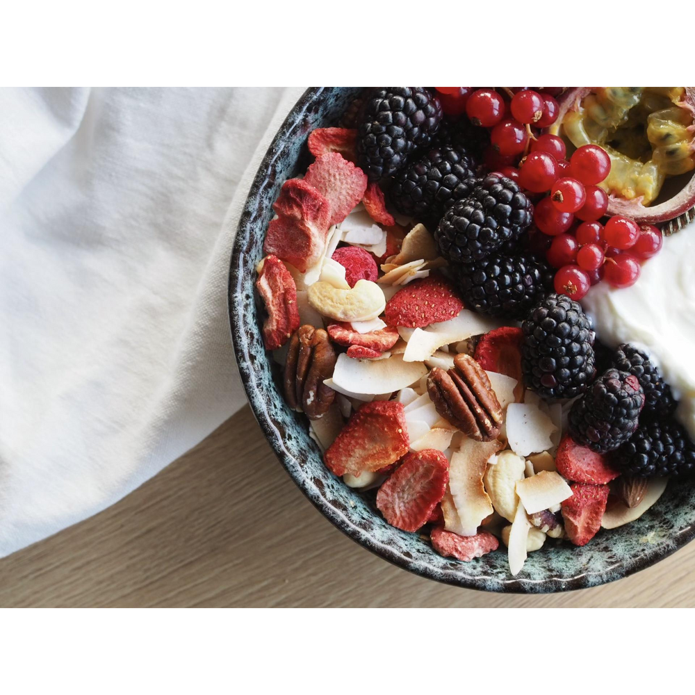 Sypaná směs pekanových ořechů, mandlí, lískových ořechů, kešu, lyofilizované ovoce a a kokosových plátků ve speciální edici LOW CARB.