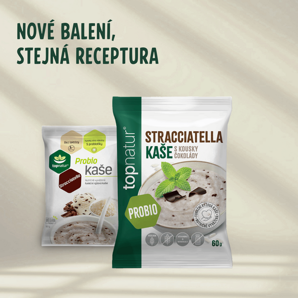 Smetanově jemná rýžová Probio kaše s kousky strouhané hořké čokolády vytváří oblíbenou příchuť Stracciatella.
