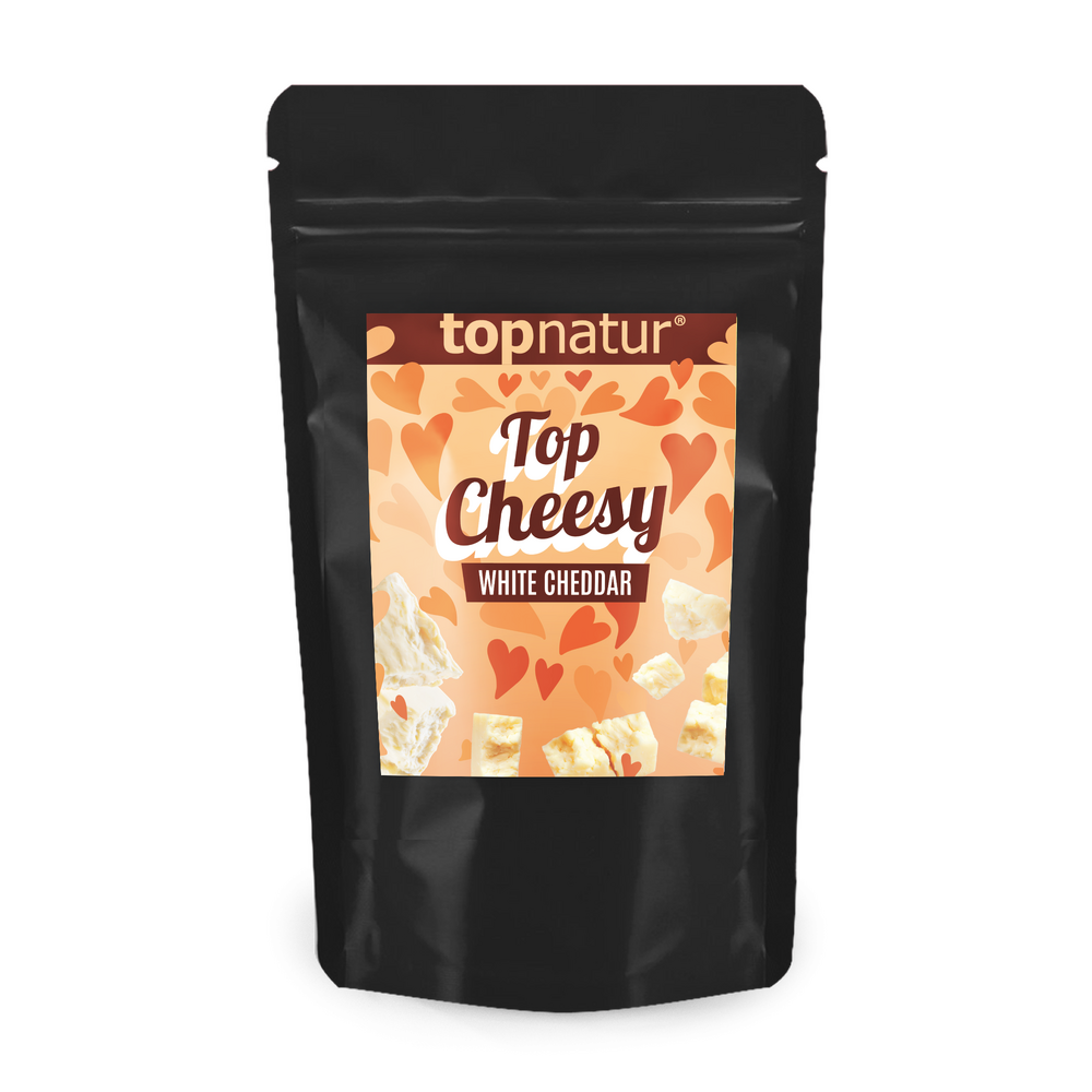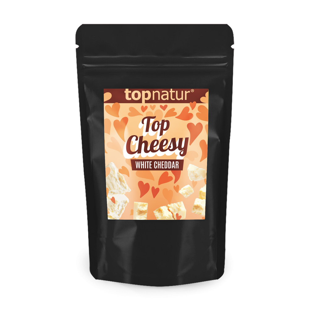Extra křupavý sušený sýr White cheddar, který se skvěle hodí k televizi, k vínu i proseccu a jako drobný valentýnský dárek pro milovníky sýrů.