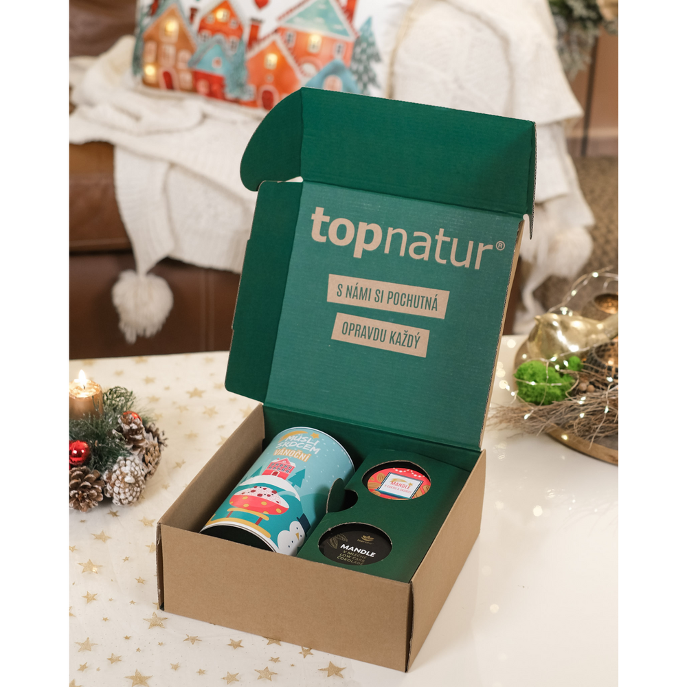 Uvnitř najdete voňavé Müsli srdcem Vánoční perníkové s křupavými oříšky a perníkovým kořením, Mandle z pece v cukru a skořici obalené v jemné sladké krustě a také Mandle v mléčné Low Carb čokoládě – klasiku v odlehčené podobě, která nikdy neomrzí.