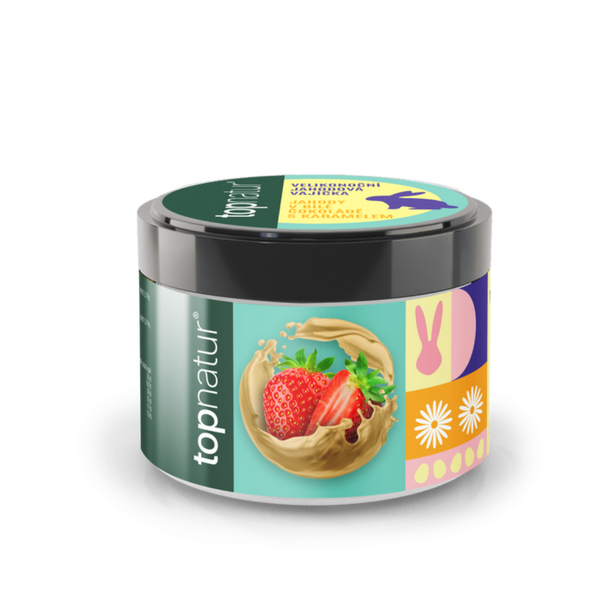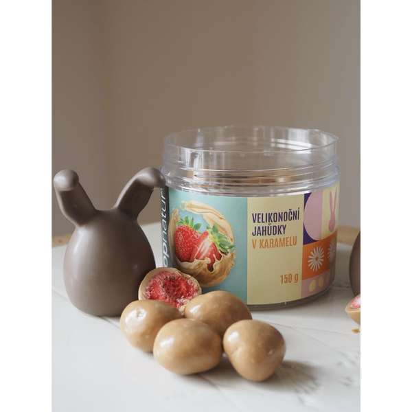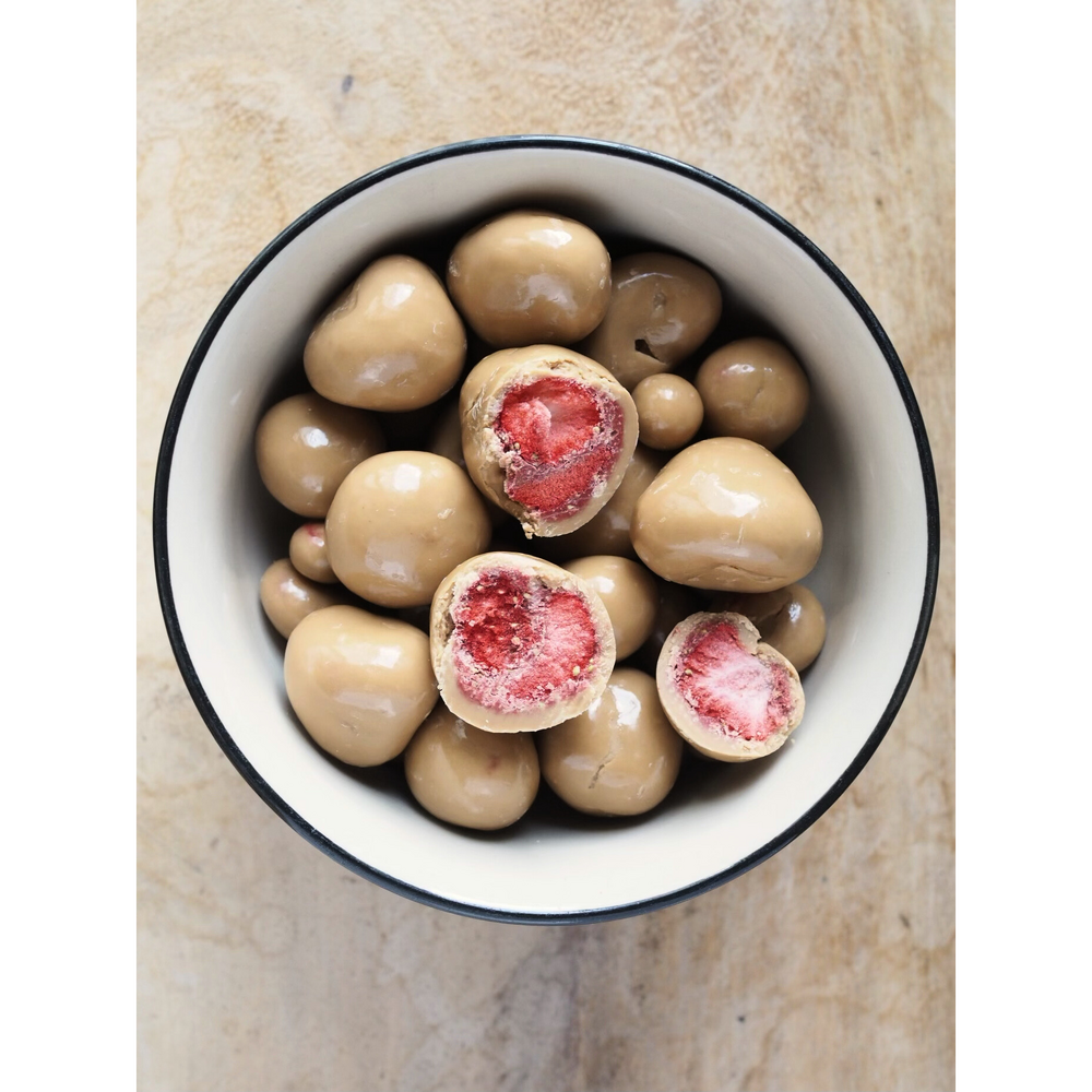 Uvnitř každého kousku se ukrývá lyofilizovaná jahoda, která si díky šetrnému sušení zachovává svou přirozenou chuť, vůni i křupavou strukturu. Obalení v jemné karamelové čokoládě dodává sladkou a krémovou chuť, která se příjemně rozplývá na jazyku.