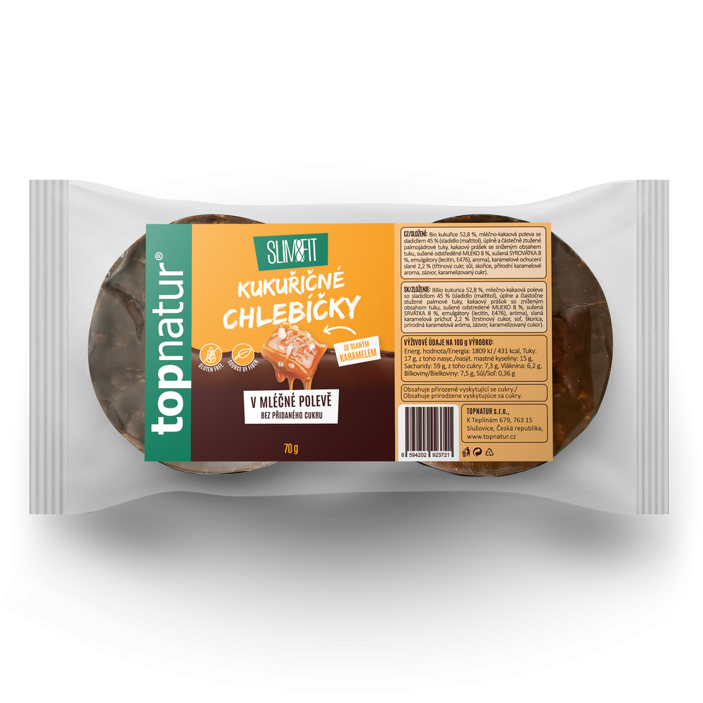 Svačina plná vlákniny so sladkou a slanou chuťou. Kukuričné chlebíčky s nádychom karamelu v jemnej mliečnej a kakaovej polevy bez pridaného cukru. Ideálne na cestovanie a do práce.