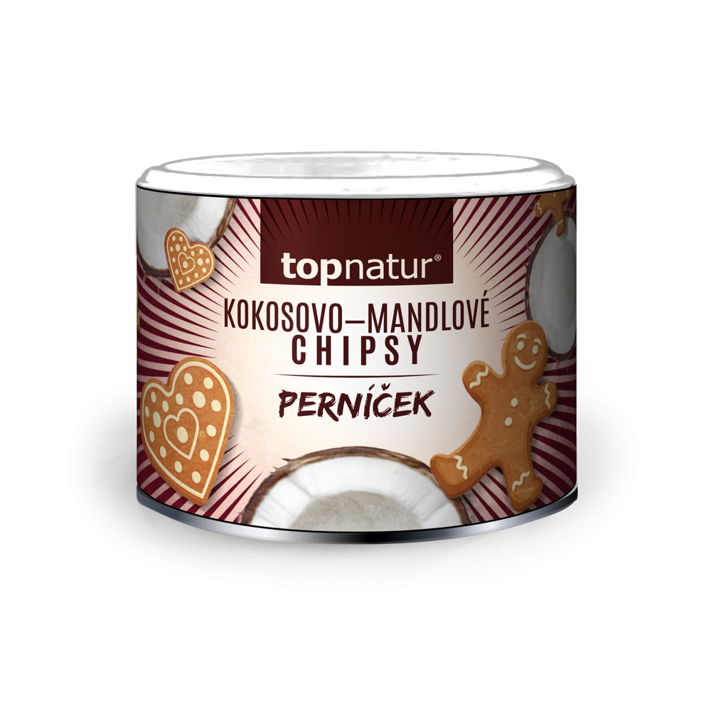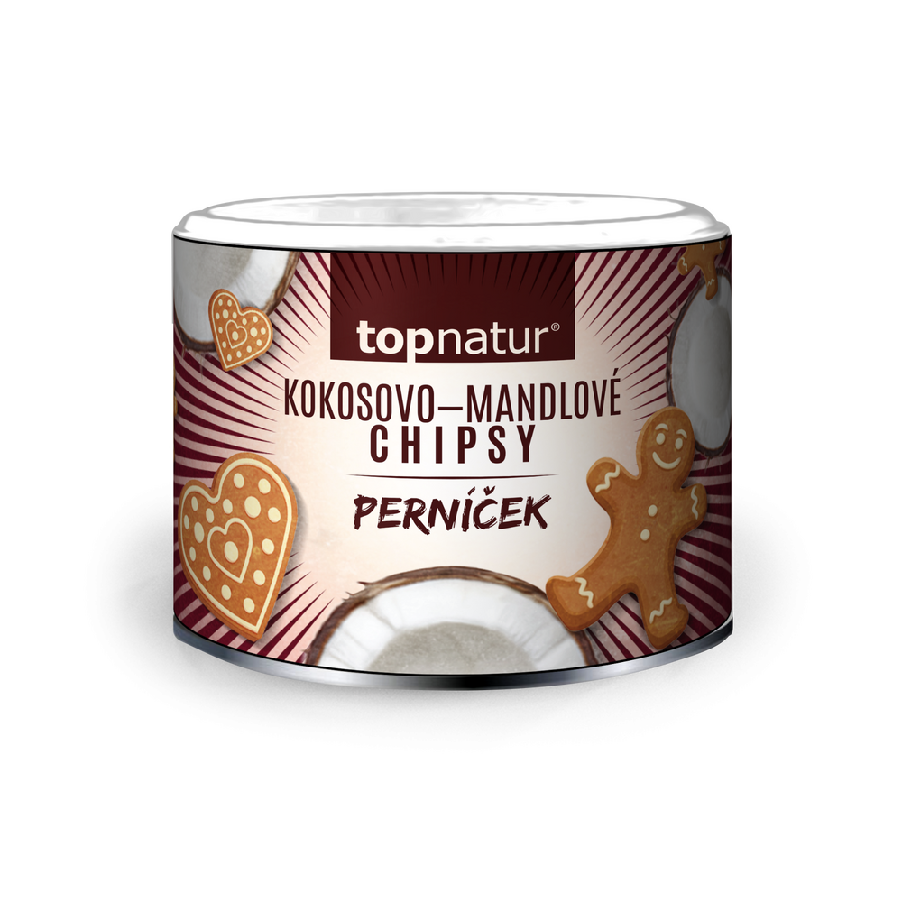 Kokosové chipsy 42 %, MANDLE plátky 33 %, trstinový cukor, čakanková vláknina, kakaové maslo, perníkové korenie 2,5 % (škorica, fenikel, aníz, nové korenie, klinček, muškátový kvet, muškátový oriešok, badián).
